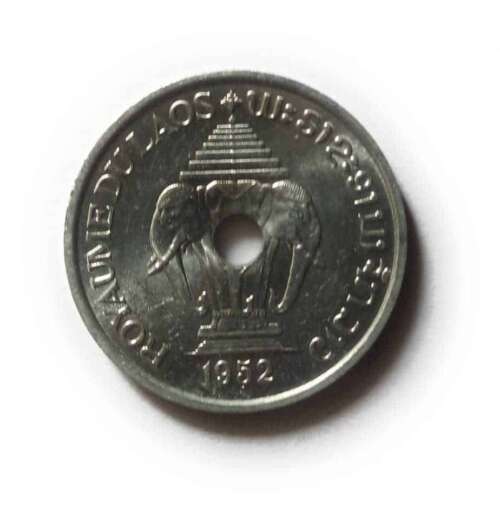 • Laos Kingdom 20 cents Sisavang Vong Hole Coin 1952 Used