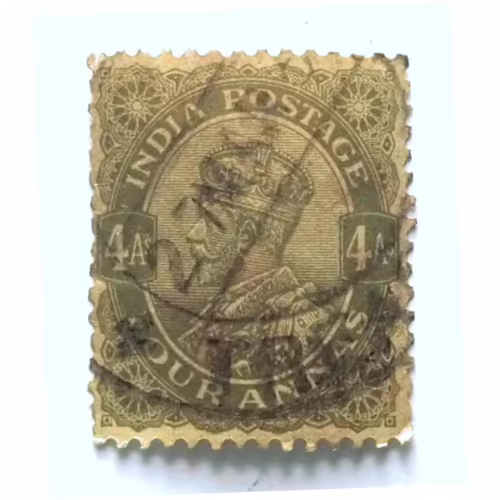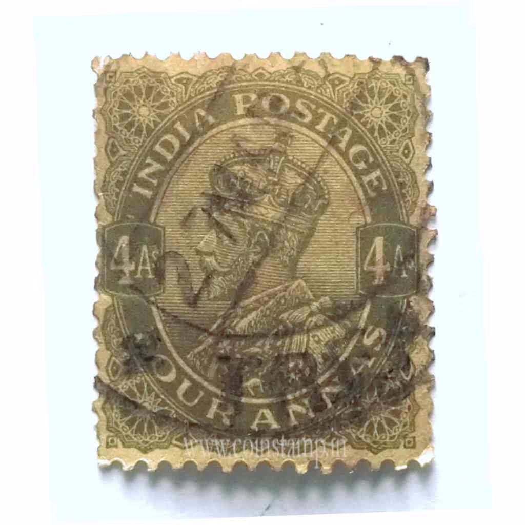 India 4 Annas George V Olive Green Postage Stamp Used